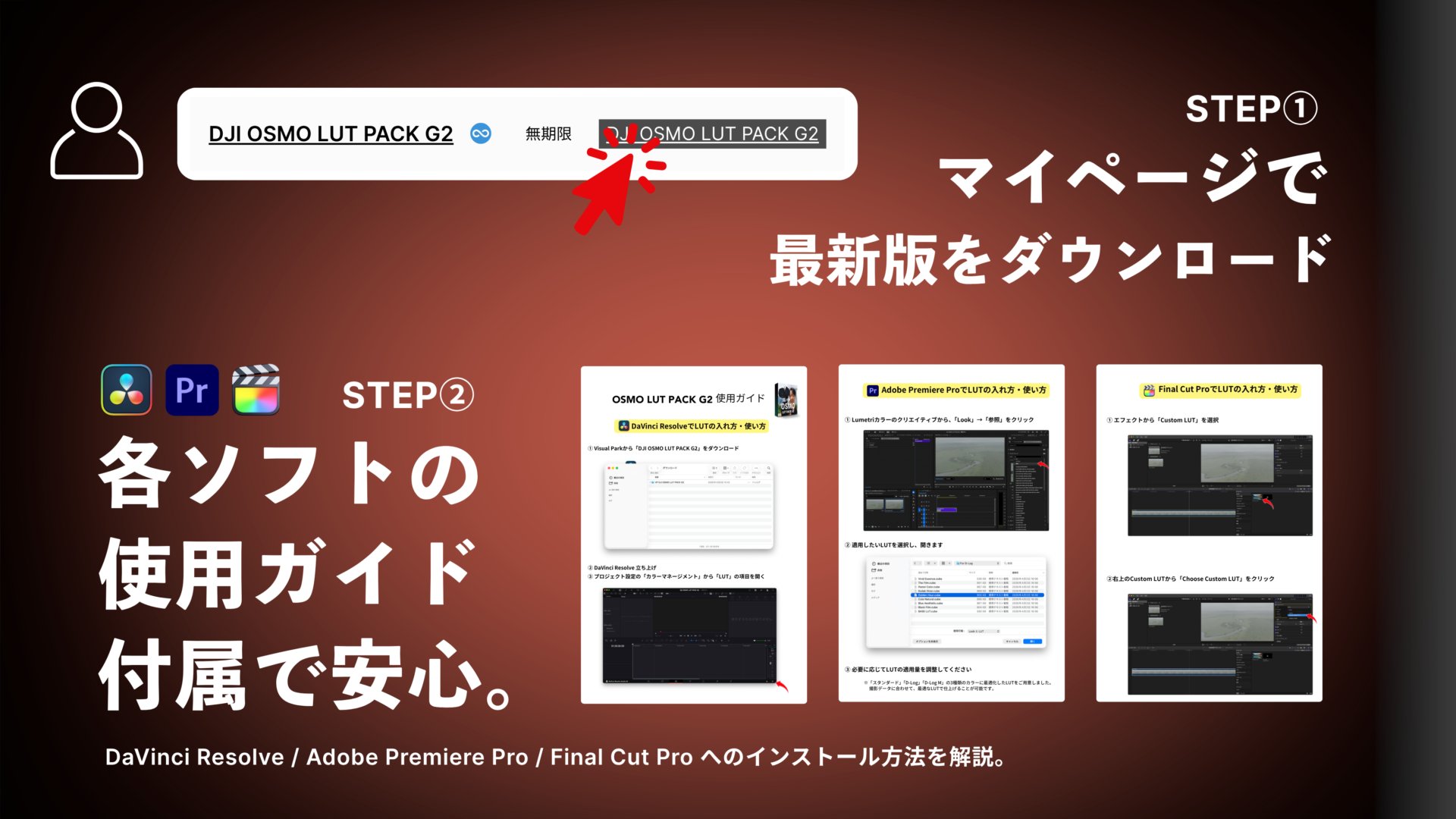 DaVinci Resolve、Premiere Pro、Final Cut Proなど、各ソフトへの導入手順を分かりやすく記載しています。