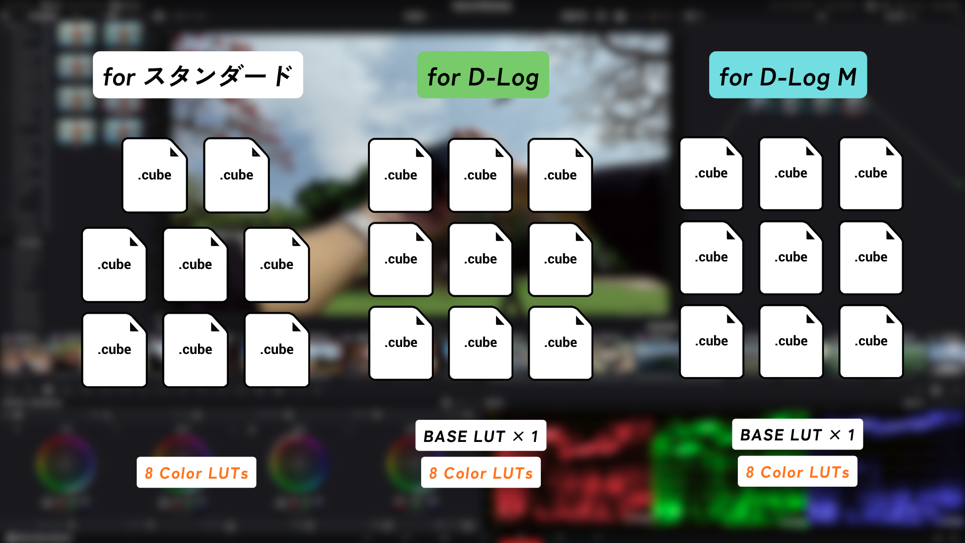 ・BASE LUT : D-Log MとD-Logのフラットな映像を、一瞬で標準的な色味へと整える変換用LUTです。